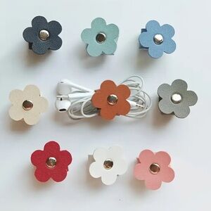 Set of two flower-shaped leather cable organizers. Perfect for keeping cords tidy.