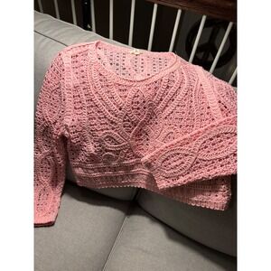 POL ONE SIZE Pink Crochet Knit Open Weave Crop Sweater Long Sleeve V Neck