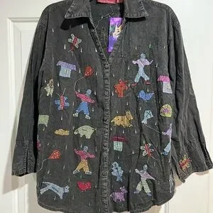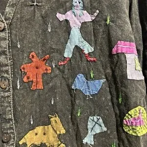 Black button-up shirt with colorful patched work. Features playful designs and vibrant details. 100% cotton matching pull on pants in closet