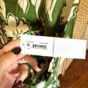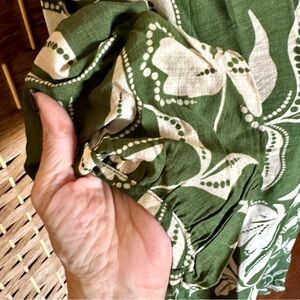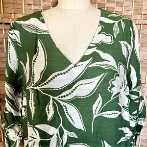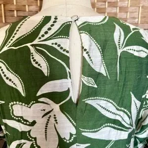 New, never worn. An easy, go-everywhere shift. Green and cream floral pattern, rayon+nylon blend. Fully lined, keyhole back w/ button closure. Three quarter length puff sleeves, v-neck, flounce hem. About 37” long. Size M, relaxed fit. Pic #1 is a stock photo.