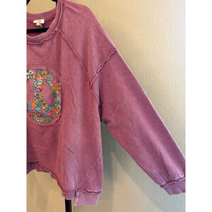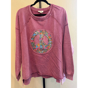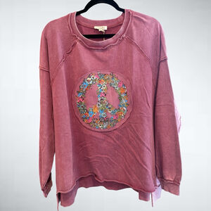Easel Oversized Peace & Petals Washed Terry Peace Sign Pullover Top in Red Bean