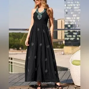 Exquisite turquoise and rhinestone embellished halter neckline and skirt create alluring style on this must-have summer sleeveless maxi dress. A flowy look and comfortable cotton fit creates effortless ease.