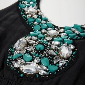 • Halter V-neckline with jeweled embellishment