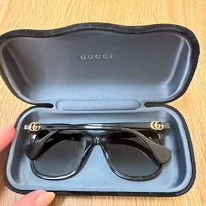 Stylish Gucci cat eye sunglasses in sleek black. Features elegant gold accents. Perfect for a sophisticated look.