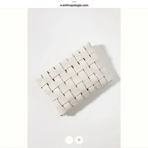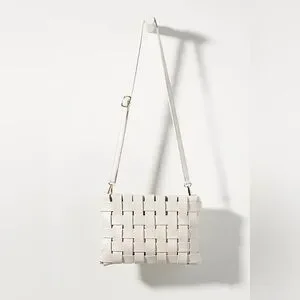 The Lindy clutch from By Anthropologie is crafted from woven polyurethane. This bag may be carried as a handheld clutch or worn as a cross body with the adjustable shoulder strap.