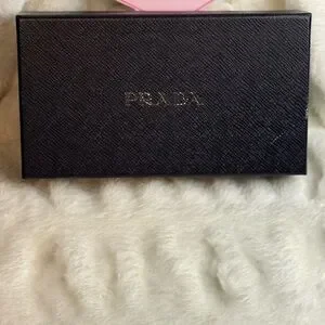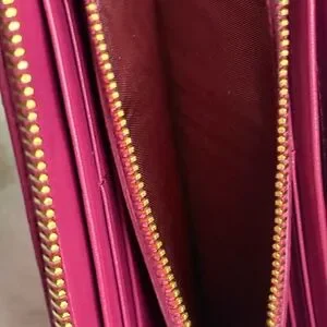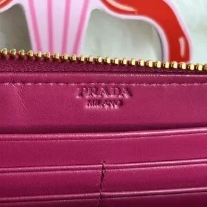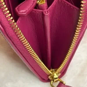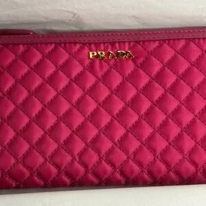Luxurious Prada wallet in vibrant fuchsia. Quilted design with gold accents. Perfect for stylish organization.
