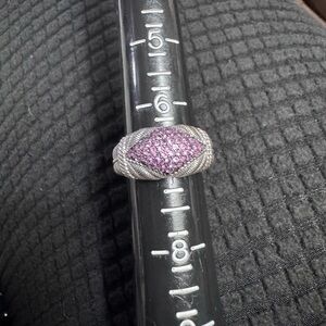 This exquisite pre-owned Judith Ripka ring features a prominent dome design with a pave setting of vibrant pink/purple stones, likely cubic zirconia or pink sapphires, set in sterling silver. The ring is elegantly framed by Judith Ripka's signature cable rope detailing, adding a classic designer touch. This piece makes a beautiful statement or cocktail ring, perfect for any occasion.