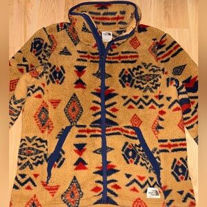 Warm fleece jacket with bold geometric design. Features a full zip and stand-up collar. Ideal for cool weather.