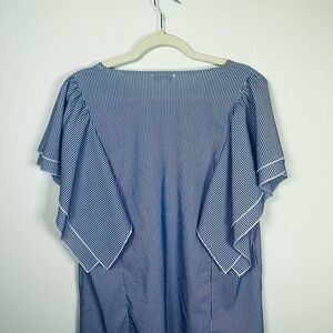 Chic blouse with flutter sleeves. Blue and white stripes add a classic touch. Ideal for casual or dressy looks.