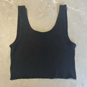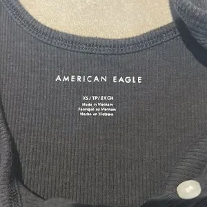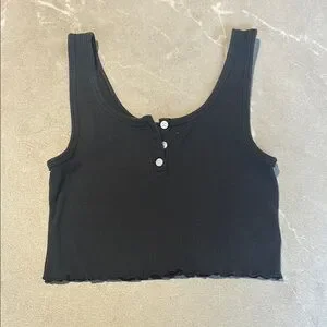 This sleek navy tank top from American Eagle Outfitters features a sleeveless design and a trendy cropped fit. Made from a comfortable knit fabric, it offers a clean and simple style perfect for casual wear. The buttoned front adds a touch of detail to this versatile wardrobe staple. Lettuce edge.
