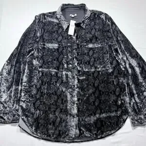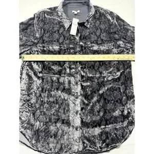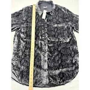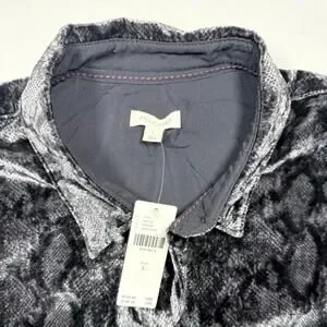 NWT Pilcro (Anthropologie) button-down shirt in a gorgeous gray/black snakeskin print with a soft, drapey feel. Features a collared neckline, front button closure, two chest pockets, and an easy relaxed/oversized fit—perfect worn buttoned up or open as a lightweight shacket.