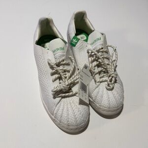 Adidas sneakers featuring a textured knit design. White base with green accents. Comfortable and stylish. I would consider these unisex but they are a women’s size 8.5. New with tags but no box.