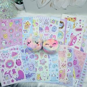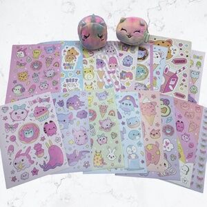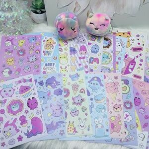 Brighten up your world with this whimsical kawaii sticker collection. Featuring delightful designs in pink, purple, and blue.