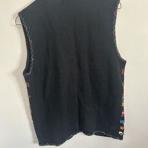 A vibrant vintage vest featuring colorful sequin embellishments on a black knit fabric. Designed by Work in Progress by Gladys Bagley, this piece offers a unique and eye-catching style.
