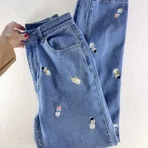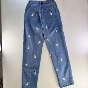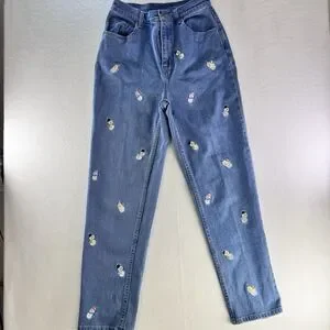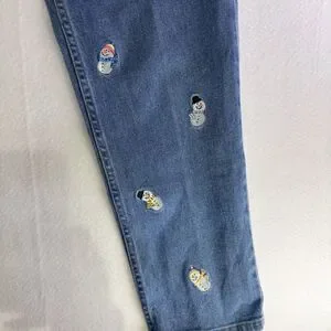 These Quacker Factory high rise jeans in women's size 6 feature embroidered snowmen, making them perfect for the winter season. Made of a cotton blend denim fabric with a medium wash, these tapered jeans have a comfortable and stretchy fit. The 5-pocket design and zip closure add practicality to the stylish garment, ideal for various occasions such as holiday gatherings, festivals, or simply casual wear in the city. Perfect for pairing with your favorite tops and shoes, these jeans are a fun addition to any wardrobe.