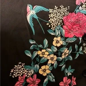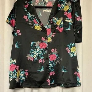 Chic pajama set with vibrant floral design. Short-sleeve button down top and matching shorts with rear pocket and tie waist.