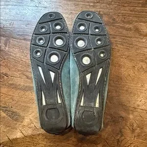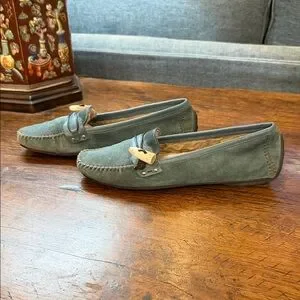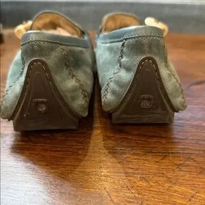 Chic teal suede loafers with unique detailing. Perfect blend of style and comfort. Lined for warmth. They aren’t marked with the size, but they’re 8 1/2 N.