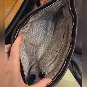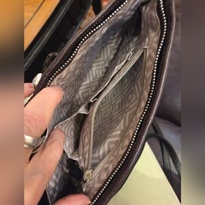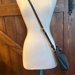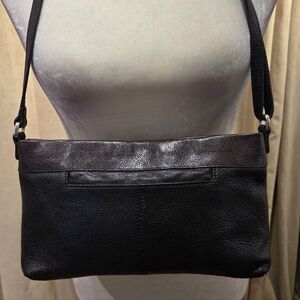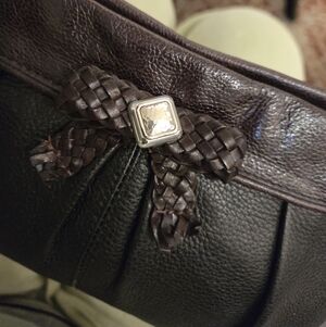 This elegant leather women's bag features a sophisticated design with a decorative bow accent. Perfect for any occasion, it combines style and functionality. Genuine leather, clean lining, adjustable shoulder strap, silver tone metals, Excellent condition, black and brown leather.