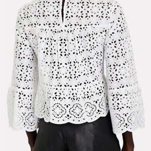 This elegant white eyelet lace top is perfect for any occasion. Its intricate design adds a touch of sophistication to your wardrobe.