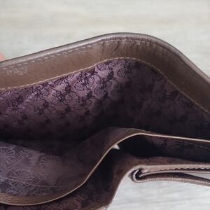 Elevate your everyday carry with this stylish Bean Pole trifold wallet. Featuring a distinctive green and burgundy plaid pattern with a textured finish, this wallet offers a touch of sophistication. The brown leather snap closure adds a classic touch, highlighted by a charming gold-tone bicycle emblem. Inside, you'll find ample space for cards, cash, and essentials. Perfect for those who appreciate quality and unique design.
