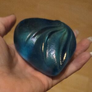 Robert Held Art Glass irridescent aqua blue heart paperweight or figurine. It is a hand-blown art glass collectible. The glass features a distinctive irridescent finish with gold, blue, and bronze tones. The piece is typically signed by the artist, Robert Held, a renowned Canadian glassblower. However this piece is not signed & missing the sticker as found on a stock photo online that also valued it at $307. These items are highly sought after as collectible art glass pieces. approx 3.5x3x1.5"