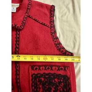 This vintage red wool knit vest, perfect for a cottage or grandma-inspired look, is a medium-sized women's garment with a classic design. Made from 100% wool, this stitched piece exudes a cozy and timeless appeal. The deep red color adds a pop of color to any outfit, making it a versatile addition to any wardrobe. Perfect for layering and adding a touch of artistry to your ensemble, this knit vest is both stylish and comfortable for everyday wear.