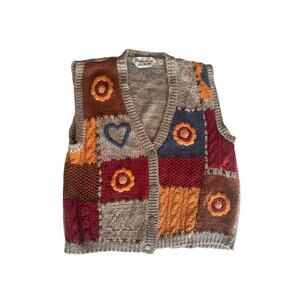 Knitted by Hand by Two Twenty patchwork vest featuring vibrant red, yellow, and blue knitted squares on a grey base. Includes charming hand-knit motifs like hearts and sunflowers scattered throughout. One-button front closure at the center adds a cozy, handmade feel. No size tag but refer to measurements for best fit. Mannequin is a women's size medium, meaning vest would suit size medium-large depending on preferred fit. Unique and playful, this is a perfect layering piece with retro, artsy vibes!