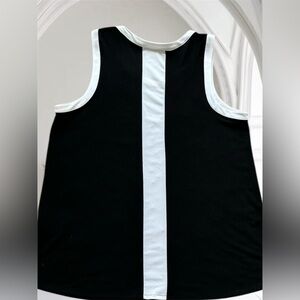 Stylish black tank top, dressy and perfect for the office or can be dressed down for more casual. Flowy and soft fabric, stylish keyhole neckline. White stripe down the back and around the neck and arms. Very cute!!! Perfect condition, only worn twice. 28” long