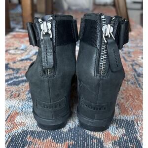 SOREL Women's Joanie II Ankle Strap Black Leather Wedge Sandals Size 8. Condition is Pre-owned - Excellent. Shipped with USPS Ground Advantage.