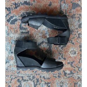 SOREL Women's Joanie II Ankle Strap Black Leather Wedge Sandals Size 8