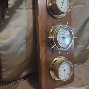 Vintage Sunbeam 3-gauge weather station, made in the USA. Features a thermometer (top), a barometer with a ship's wheel accent (center), and a humidity gauge/hygrometer (bottom). This piece has a beautiful wood plaque backing and gold/brass-toned bezels. A classic piece of nautical home decor.