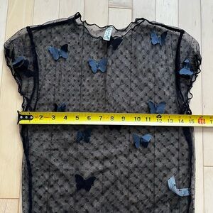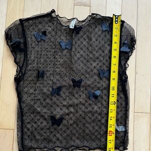 Chic black lace top with butterfly details. Sheer and stylish design.