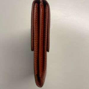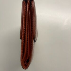 Stylish tan wallet with iconic LV logo. Features a textured surface for added elegance.