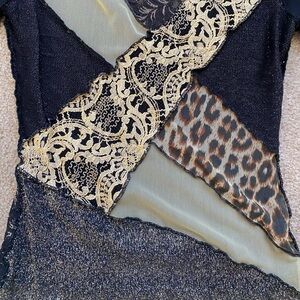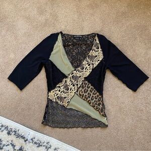Beautiful vintage Y2K Ann Ferriday patchwork design blouse with lace and leopard accents. Women’s size S. (Tag says “One Size” but fits like a size small.) Sheer lace back. In good pre-loved condition. Smoke free home.
