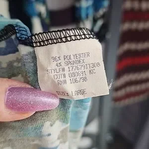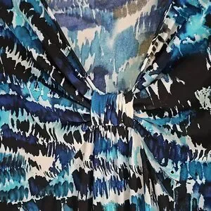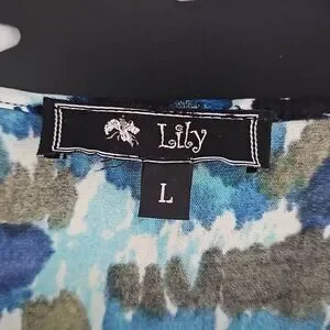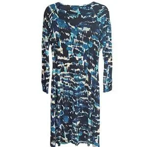 Lily A-line, V-neck, longsleeve dress. Black, blues, splashes of green and white. Spring, summer, vacation, or work dress. Size Large. Measurements approximate: Length 41 inches, Pit to Pit 19 inches, and waist 17 inches. Smoke and Pet free home.