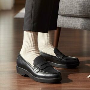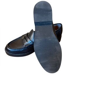 Elevate your wardrobe with these Nordstrom black leather penny loafers, featuring a sophisticated 1.25" block heel for the perfect lift. Crafted from high-quality leather with a classic round toe and traditional penny strap, these shoes are the ultimate staple for a Dark Academia, Preppy, or Minimalist aesthetic. They are in Like New / Mint condition (NWOT), showing no signs of wear, though they do not include the original box or tags. Perfect for office wear, professional settings, or polished weekend looks, these versatile flats offer a timeless, high-end feel.