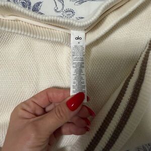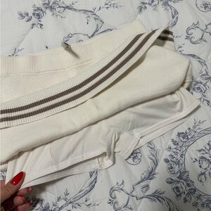 Elegant knit set by ALO Yoga. Includes a cream cardigan, crop top, and skirt with brown stripes.