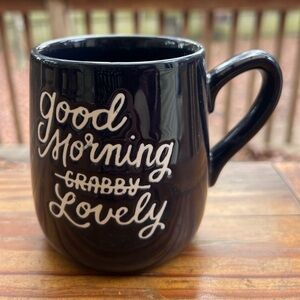 Cobalt blue stoneware mug with fancy white incised text that reads, Good Morning CRABBY (with a line through CRABBY and replaced by) Lovely (underneath). Stylish upswing handle. Dishwasher and microwave safe. Approximately Measures 4” tall with a 3” diameter; 4.75” across including handle. Holds 14 fluid oz.