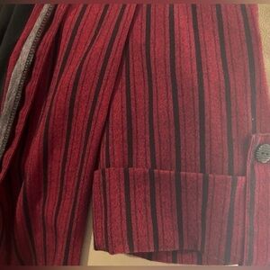 Dina & Ariel blouse with burgundy and black stripes, collared design, built-in tank, and shoulder pads.