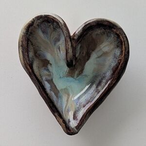 Gorgeous heart-shaped trinket dish in shades of brown, khaki, and light turquoise; beautifully fashioned pottery piece with a lovely swirled design; perfect as a decorative piece... BRAND NEW/NEVER USED... MAKE ME AN OFFER on this pretty trinket dish! 🤎😊🩵😊🤎