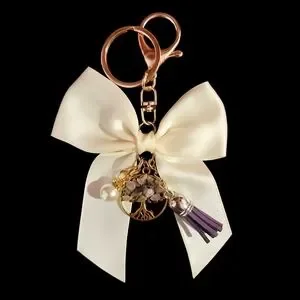 Add a touch of elegance and intention to your bag or keys with this handcrafted amethyst keychain charm. This design features a Tree of Life pendant adorned with natural amethyst chip stones, a faux pearl accent, and a soft purple suede tassel—all tied together with a luxurious ivory satin bow and rose gold hardware.