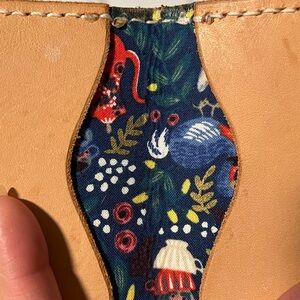 Tan leather card holder featuring a vibrant floral interior. Perfect for organizing cards.