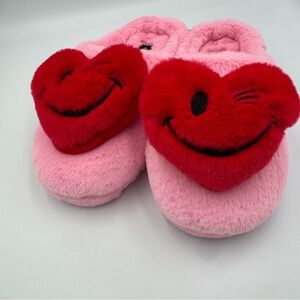 Cozy pink fuzzy slippers featuring a red heart smiley design. Perfect for lounging and for Valentine’s Day for your girl.