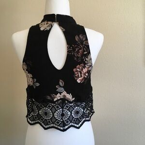 Cropped floral top with lace detailing around the bottom. Material is a lightweight crepe fabric, keyhole button opening in the back. Very pretty for any occasion. Only worn once, perfect condition.