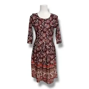 A soft and comfortable boho-inspired fit-and-flare dress in rich burgundy, rust, and ivory floral tones. Designed with a pleated bodice, scoop neckline, 3/4 sleeves, and a contrasting border-print hem. Stretch-knit fabric offers an easy, flattering silhouette perfect for work, brunch, or everyday wear.