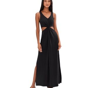 black maxi dress, beyond yoga, cutout maxi, twist front, travel dress, resort wear, side slit maxi