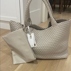 Elevate your style with this chic woven gray tote bag, complete with a matching pouch. Perfect for everyday use, it combines elegance and practicality.