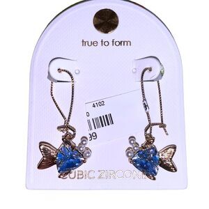Gold Tone Blue Cubic Zirconia Fish Hook Dangle Earrings New with Tag