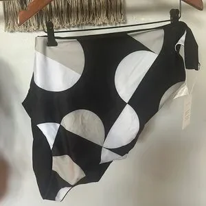 Make a statement at the beach with this chic black and white one-shoulder swim one piece. Perfect for a modern and bold look. No tags