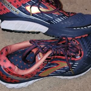 Dynamic Brooks shoes in blue and red. Features striking gold highlights. Ideal for running. These are sold as is! what you see is what you get! older pair of Brooks in very gently used condition with minor flaws/signs of use. Bottom dollar bargain shoes if you're looking for a cheap pair!